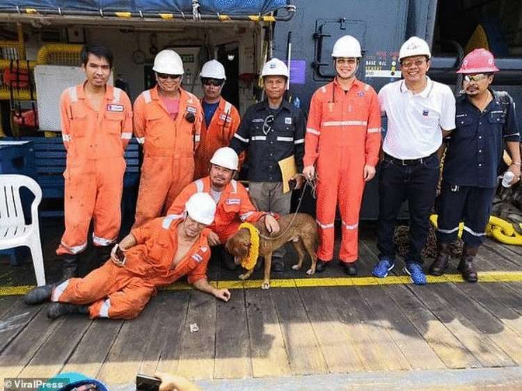 Через два дня мимо проплывал тайский танкер и спасенного пса передали экипажу для доставки на берег. Спасители-буровики напоследок сфотографировались с Бунродом.