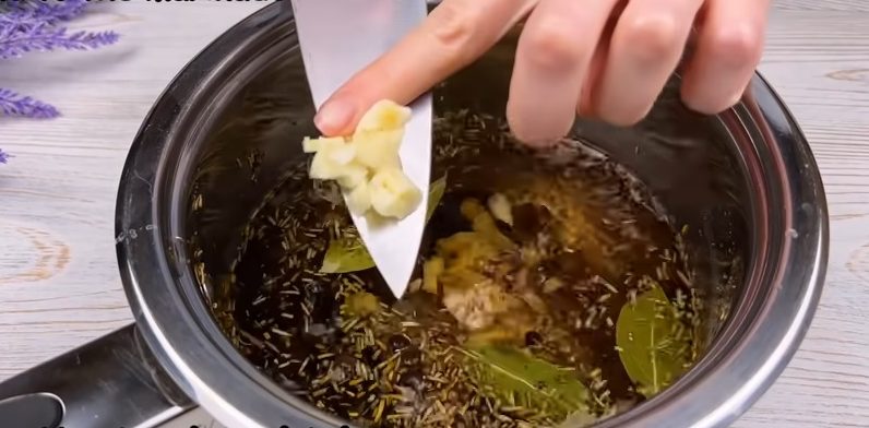 Поставте каструлю на вогонь і після закипання води проваріть 3-4 хвилини. Зніміть з вогню і дайте суміші повністю охолонути. Додайте шматочки часнику.