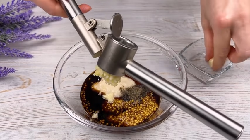 У меншій мисці змішайте насіння гірчиці з соєвим соусом, солодким соусом чилі, олією, хроном, меленим перцем і подрібненим часником.