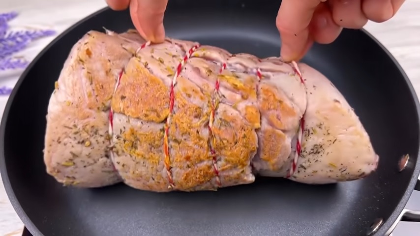 Перев’язуємо м’ясо, як показано на зображенні нижче, після чого обсмажуємо його з усіх боків на сухій сковороді, на максимальному вогні.
