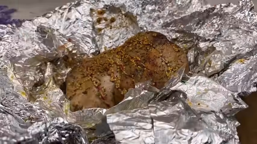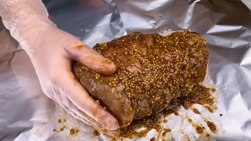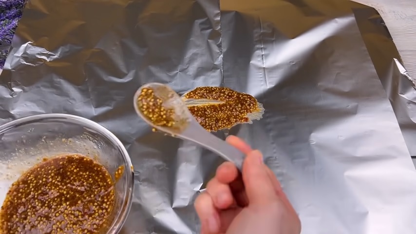 Підготуйте більший шматок алюмінієвої фольги та покладіть в середину 1 столову ложку суміші гірчиці та спецій. Зверху викладаємо м’ясо і обмазуємо його з усіх боків цією сумішшю.