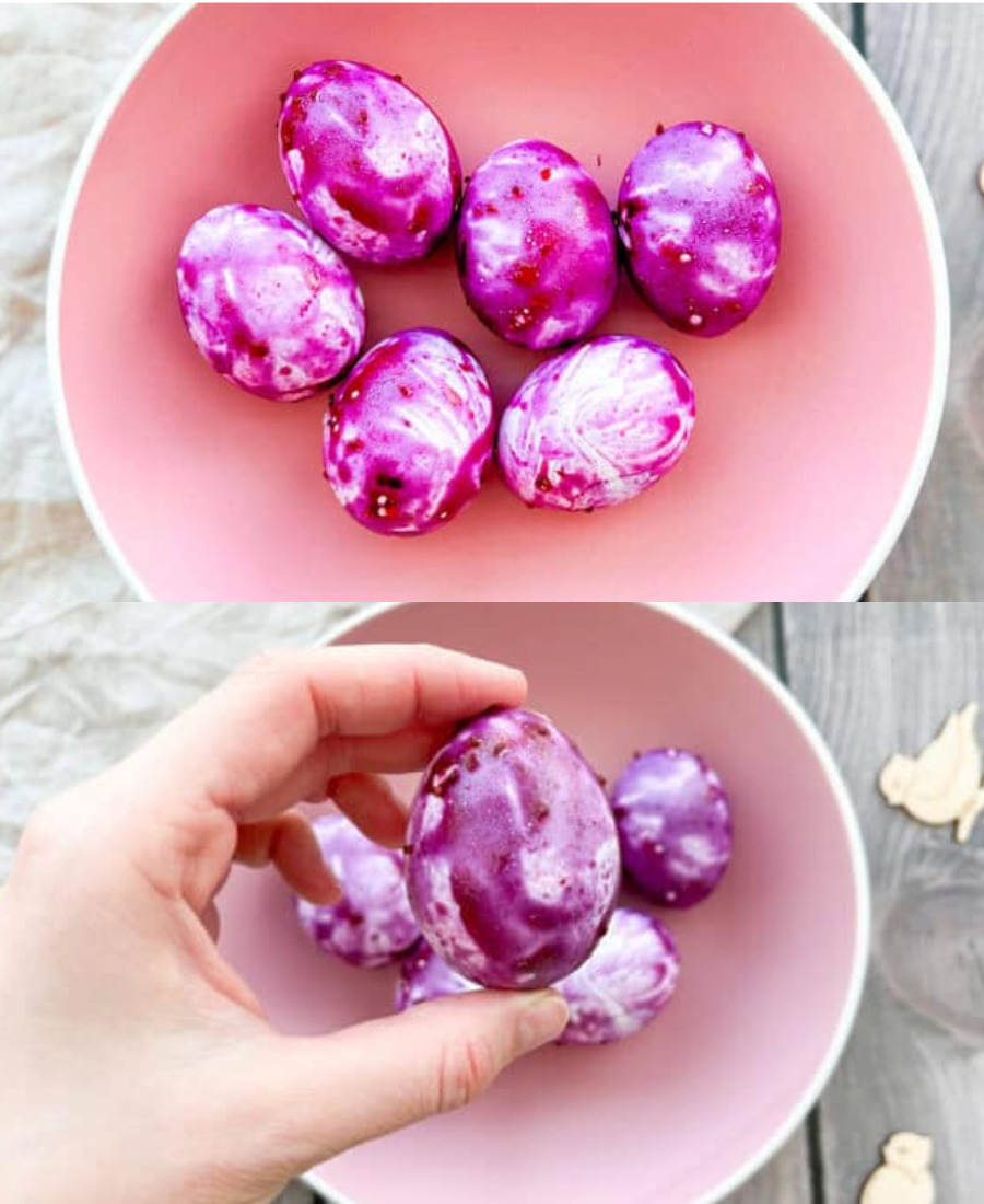 - После окрашивания аккуратно протрите яйца бумажным полотенцем — мраморный эффект станет ещё выразительнее