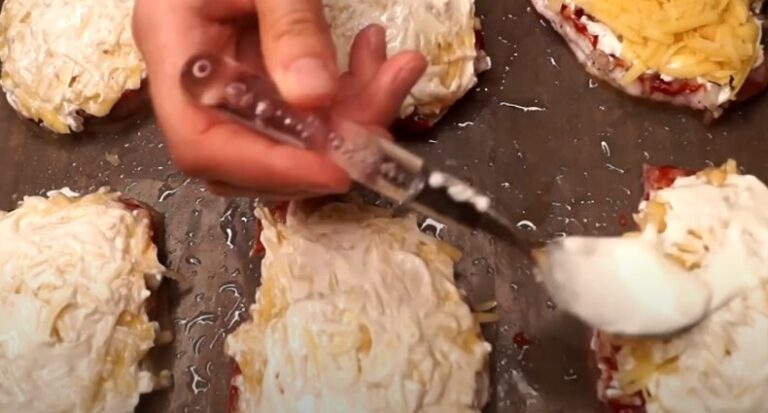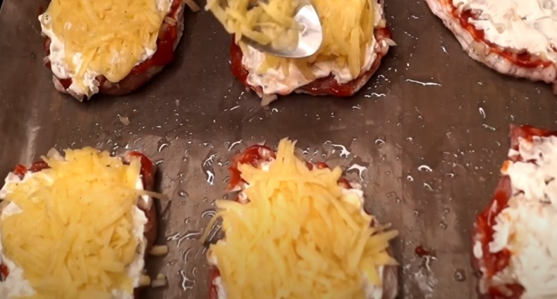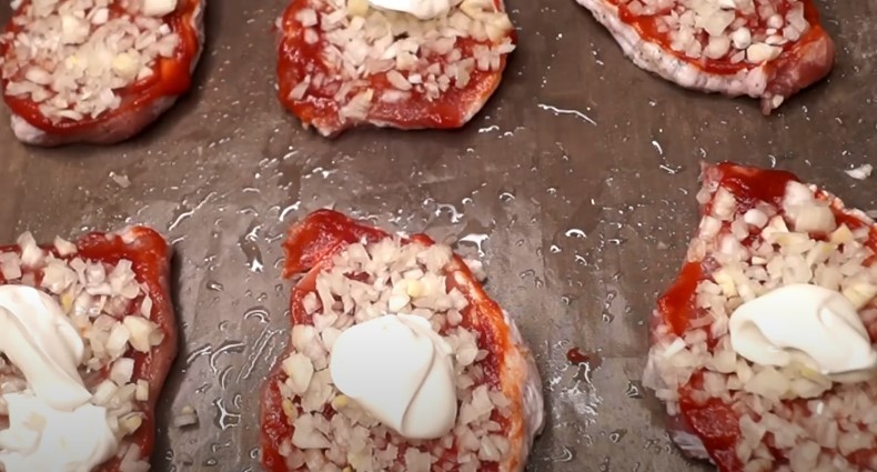 М’ясо кладемо на лист застелений папером для випічки, змащений олією. Зверху змащуємо шматочки м’яса кетчупом або можна покласти дрібно нарізані свіжі помідори. На кетчуп кладемо дрібно посічену цибулю. Змішаємо сметану і майонез, та змащуємо цибулю.