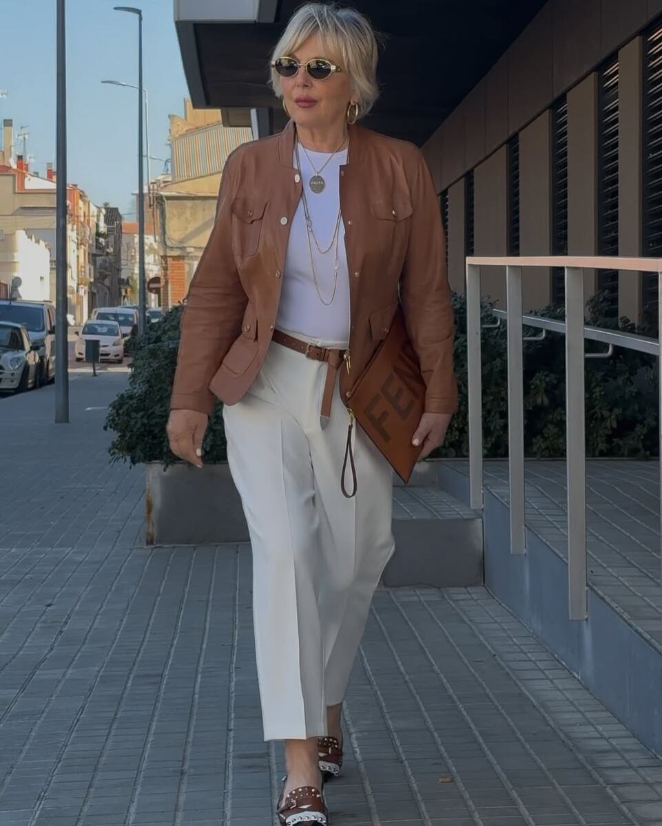 Розстібнутий жакет або сорочка поверх майки — стильна ідея. Але варто уникати безрозмірних кардиганів, які додають об’єму і років.