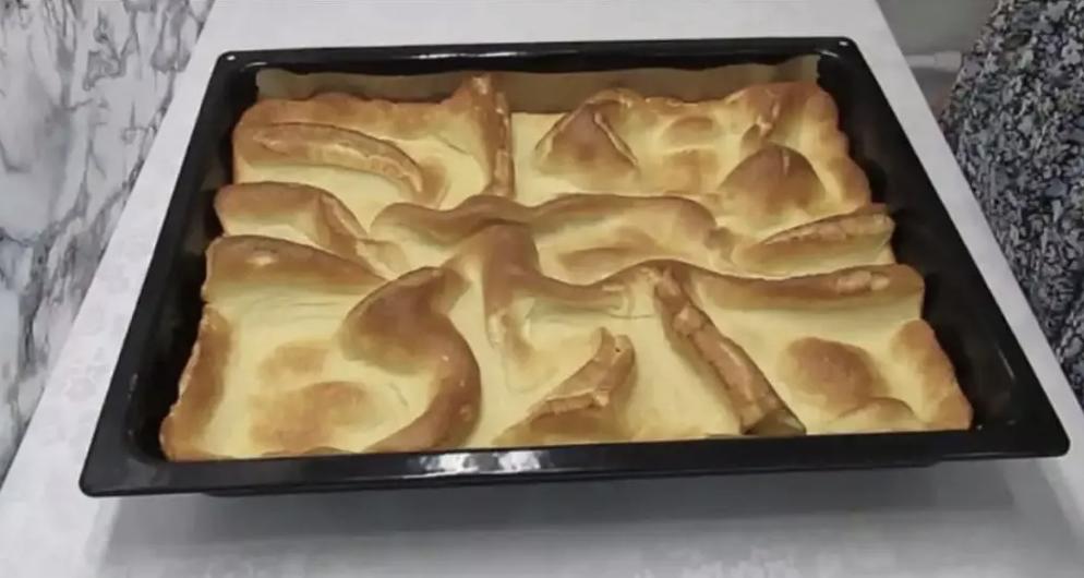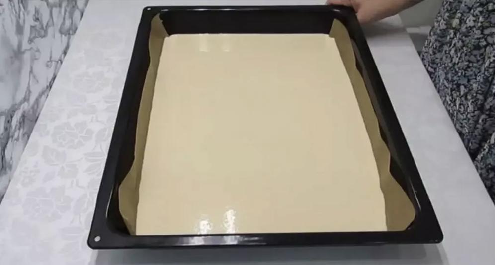 Вылейте тесто на противень или в большую форму, дно лучше застелить пергаментном (примерно 43×33 см). Готовьте при 190°C в духовке 25 минут.