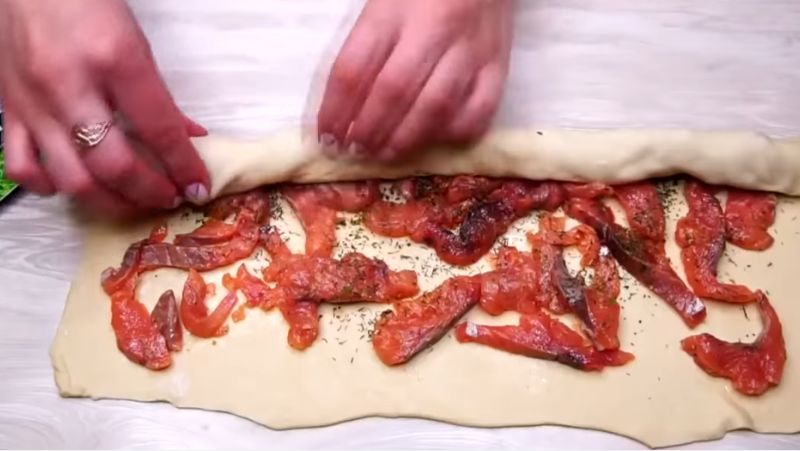 Беремо листкове тісто, будь-яке, у мене без дріжджового 2 пласти по 250 гр. Беремо один пласт, розкачуємо у прямокутник, рівномірно розподіляємо рибу по пласту тіста, посипаємо сушеною зеленню петрушки та кропу.