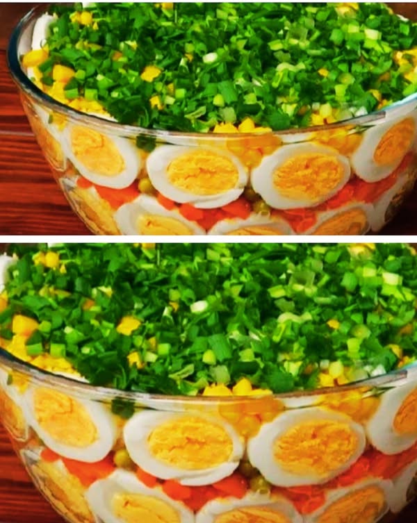 Подавати цей салат обов’язково потрібно у глибокому, прозорому, скляному салатнику, щоб ніщо не могло приховати його красу.