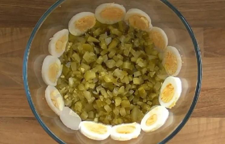 На дно салатнику викладаємо огірочки. Змащуємо їх трохи заправкою. Кружечки яєць притуляємо до стін тарілки.