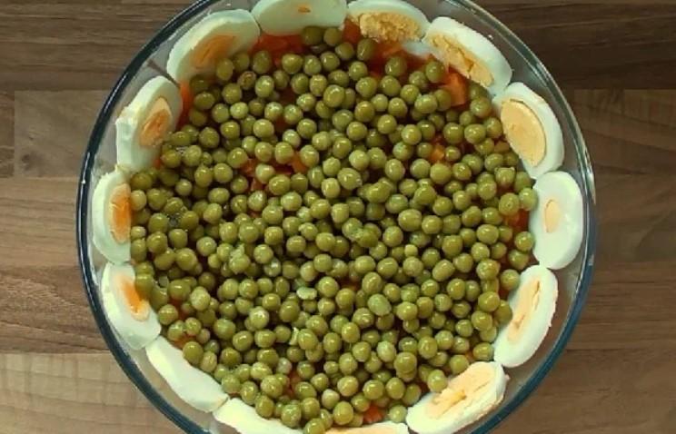 Наступний шар — горошок і заправка. Далі нарізані кубиками яйця та заправка.