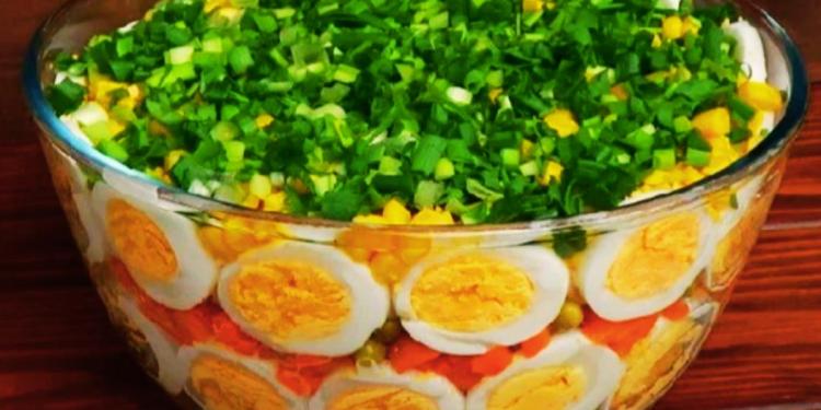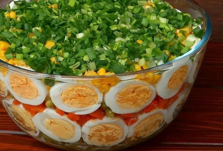 Зверху кукурудза та заправка. Ну і фінальний шар — це зелена цибуля. Під час викладання кожного шару інгредієнтів не забувайте розміщувати по бортах салатнику нарізані кружечками яйця.