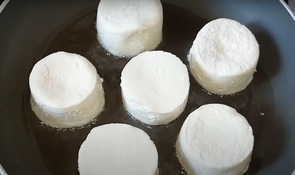 Не забуваємо обваляти сирники в борошні. У сковороді з олією обсмажуємо сирники до золотистого кольору з обох боків.