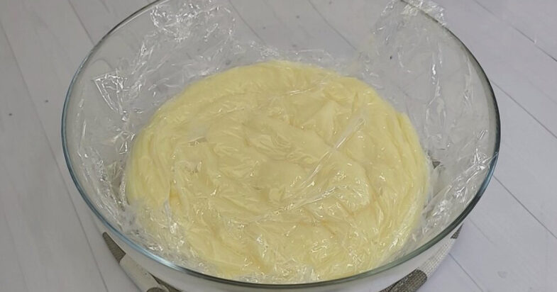 Готовый заварной крем переливаю в другую емкость и накрываю пленкой в контакт (чтобы в процессе охлаждения на поверхности не образовалась корочка). Даю остыть до комнатной температуры.