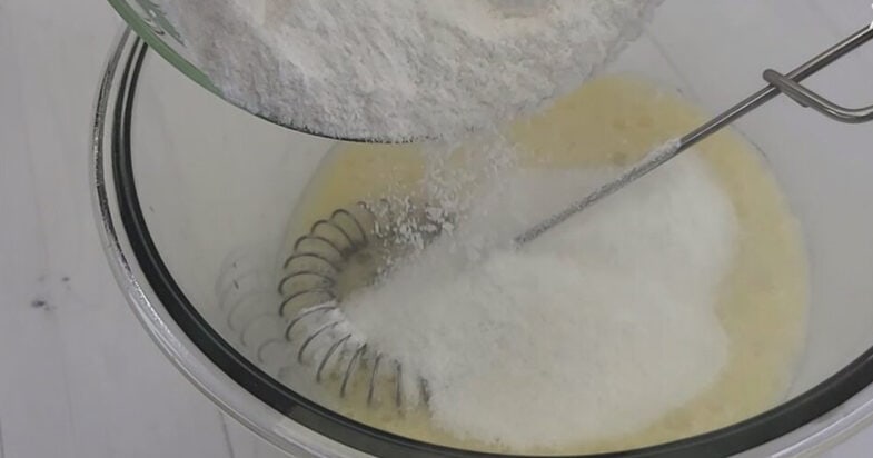 Отдельно соединяю сахар с крахмалом и хорошо перемешиваю. Добавляю в 2 мероприятия смесь сахара с крахмалом к яйцам.