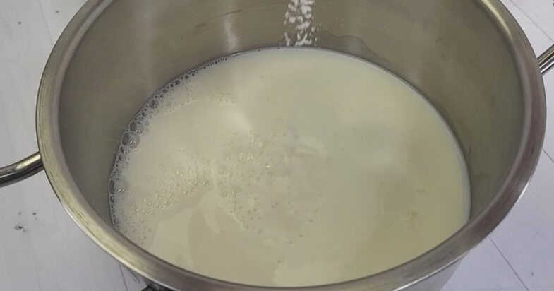 В кастрюлю с толстым дном выливаю молоко и добавляю щепотку ванилина. Ставлю на плиту и, периодически помешивая, довожу почти до кипения.