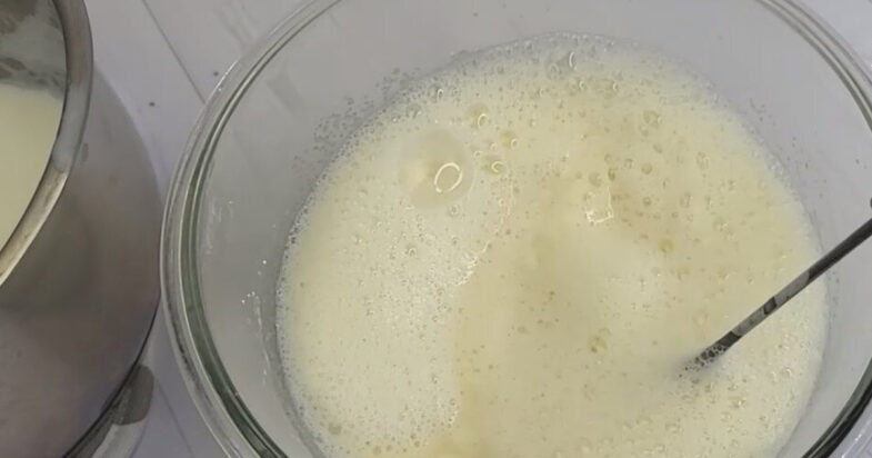 Над молоком пошел активный пар, оно вот-вот готово закипеть. Снимаю его с плиты и аккуратно вливаю в подготовленную смесь, непрерывно перемешивая. Так переливаю большую часть молока.
