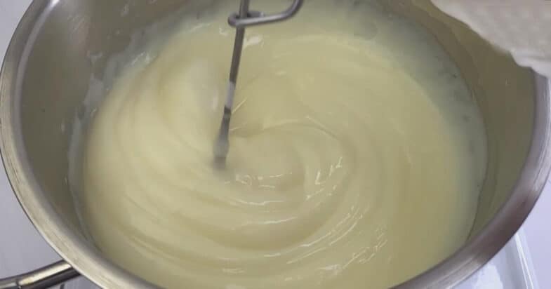 Когда крем загустел, снимаю кастрюлю с плиты и тщательно перемешиваю крем до гладкости. Затем снова ставлю на плиту и провариваю до готовности еще 20-30 секунд на небольшом огне.