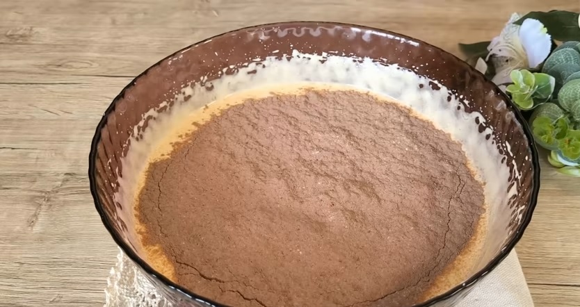 Додаємо олію, молоко, просіяне борошно разом з какао-порошком і розпушувачем.