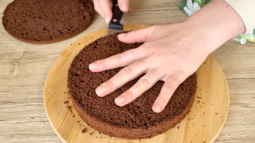 Після випікання переверніть верх, зніміть папір для випічки і дайте охолонути. При необхідності дорівнюємо, після чого розрізаємо верхівку на 3 частини.
