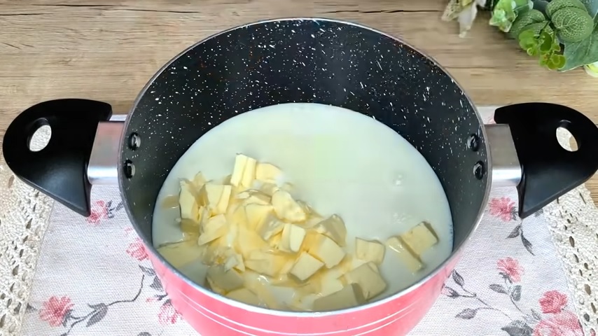 Для начинки покладіть цукор і молоко в каструлю. Додати згущене молоко, шматочки масла і поставити на вогонь.