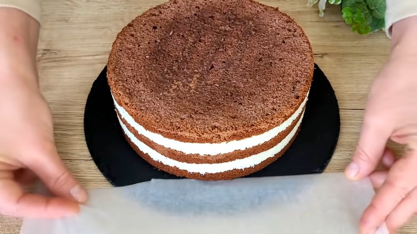 Верхівку сиропуємо молоком або вершками і наповнюємо кокосовою начинкою. Поставити торт в холодильник на 2-3 години.
