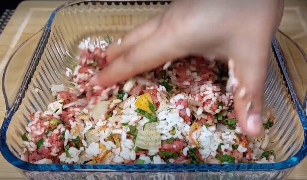 У великій глибокій тарі змішуємо фарш з дрібно нарізаною цибулею і відвареним рисом. Шинкуємо дрібно кріп і петрушку, разом із сіллю, куркумою, паприкою, коріандром, чорним перцем і зірою, додаємо у фарш, перемішуємо та відбиваємо.