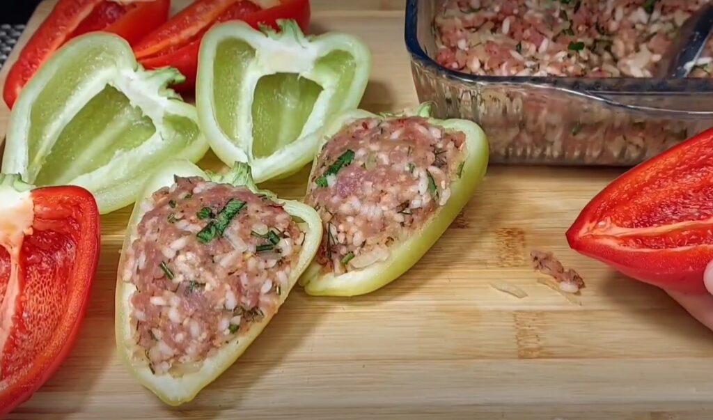 Розрізаємо 4 перці на дві частини, видаляємо начинки. У перці викладаємо фарш, утрамбовуємо начинку.