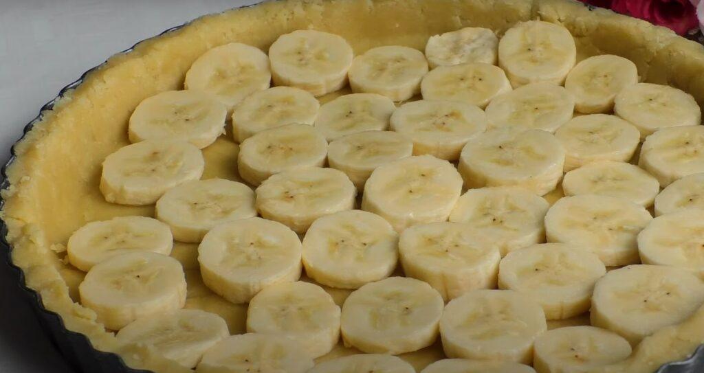 Нарізаємо тонкими кільцями очищені банани, викладаємо на корж із вершкової крихти.