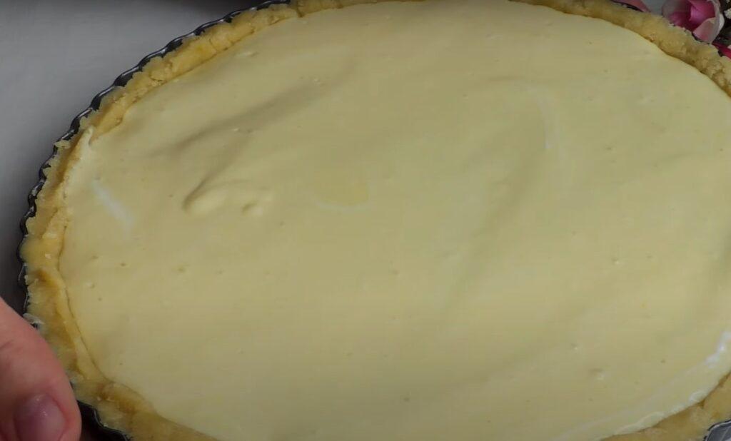 У форму діаметром 24 см викладаємо вершкову крихту, продавлюємо склянкою, щоб вона краще прилягала до дна. Не забуваємо також сформувати борти з крихти.