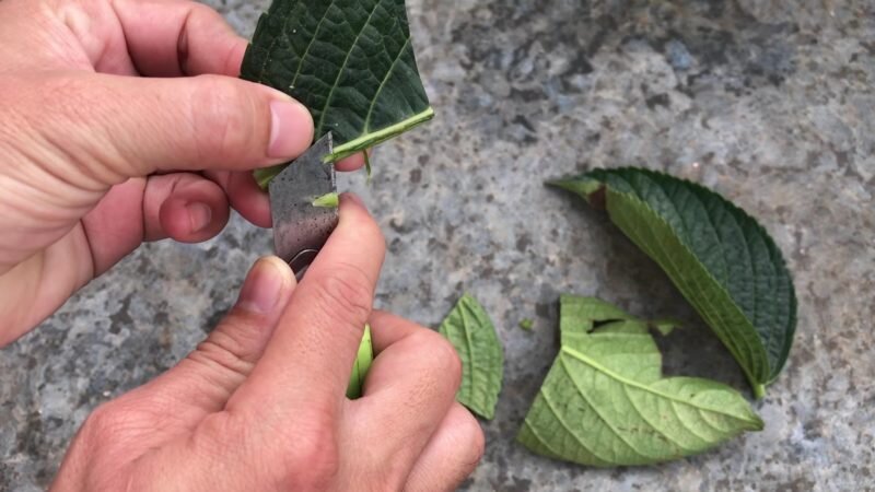 Аккуратно срежьте нижнюю часть, оставив черешок и жилку. Затем сделайте тонкий продольный надрез вдоль центральной жилки — так лист лучше соприкоснётся с почвой.