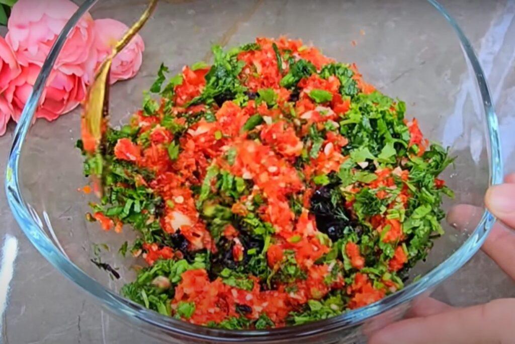 У блендері подрібнюємо очищений болгарський перець, гострий перець та зубчики часнику. Шинкуємо дрібно кріп, петрушку, кінзу та базилік, змішуємо з отриманою масою з перців.