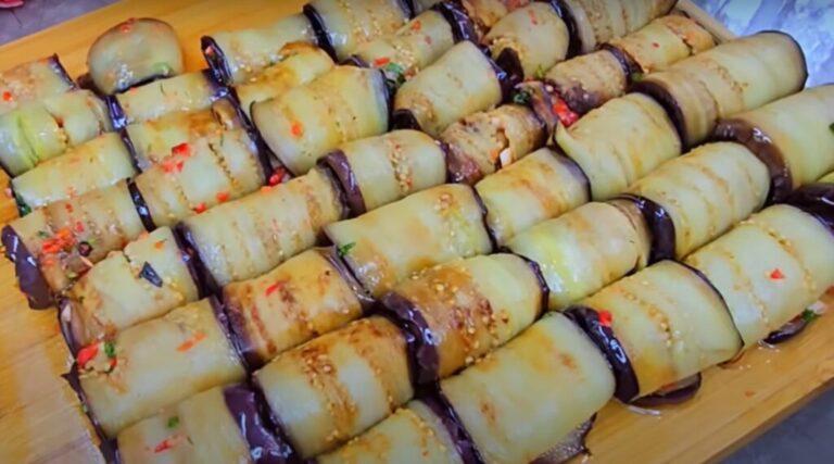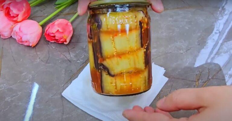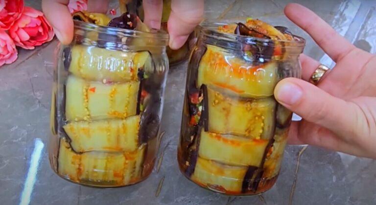 Перекладаємо рулети з баклажанів у банки по 0,5 літрів, щільно утрамбовуємо.