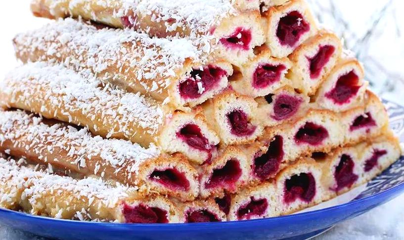 9. На каждую из полосок теста плотно друг к другу положите ягодки вишни. Края теста крепко нужно соединить и защипать.
