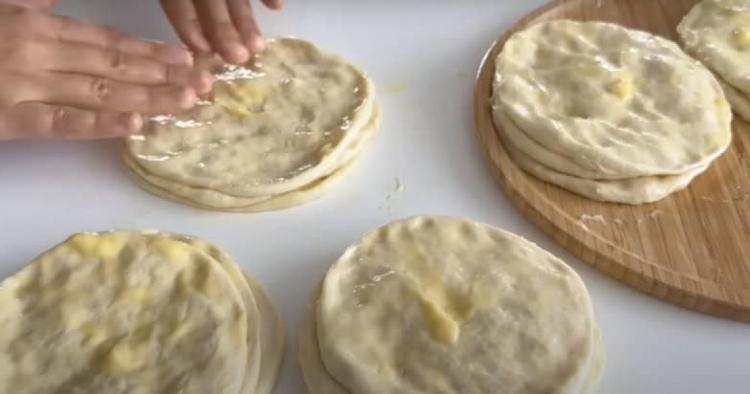 Готуємо коржики. Розплющіть кульки в невеликі коржі, змащуйте кожен вершковим маслом. Складайте по 3 один на одного, знову накрийте плівкою на 20 хвилин.