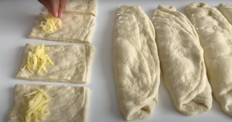Формування рулетиків. Кожну стопку з трьох коржів руками розтягуйте в прямокутник. Складіть тричі (як конверт), притисніть. Наріжте на 4 квадрати, на кожен викладіть тертий сир і згорніть у рулетик.