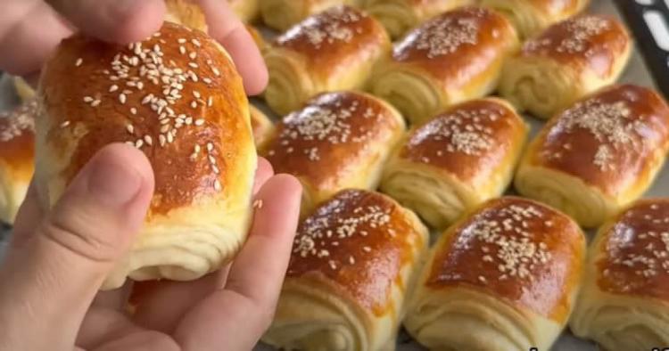 Випікання. Рулетики викладіть на деко з пергаментом. Накрийте на 10 хвилин. Потім змастіть жовтком, посипте кунжутом і випікайте при 180°C до золотистої скоринки.