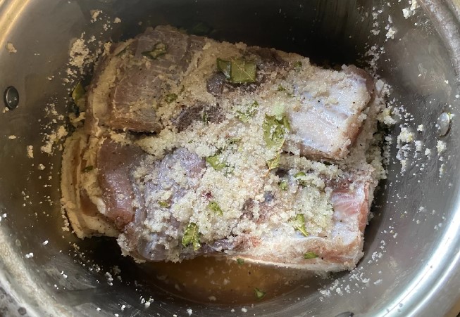 Просолювання. Додайте лавровий лист і трохи подрібненого перцю. Укладіть м’ясо в глибоку ємність, накрийте і притисніть гнітом.