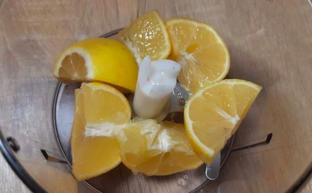 Лимончики нарезаем на небольшие дольки, чтобы блендере было легче. Шкурки выбрасывать не нужно. Перебиваем. Если блендера у вас нет, то тогда снимите цедру с двух лимонов с помощью мелкой терке, а затем выдавите к ней весь сок из фруктов.