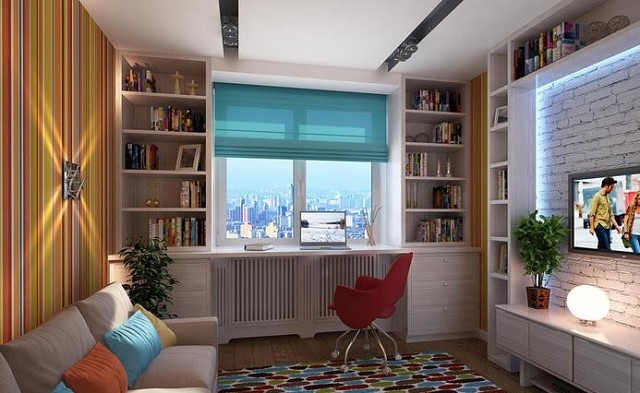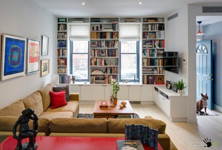 Вітальня – навколо вікна можна розмістити книжкові полиці або вітрину для декору, що зробить приміщення більш стильним і практичним.