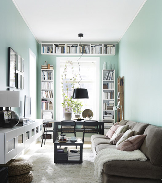 Таке розташування меблів дозволяє задіяти стіну, яка зазвичай залишається порожньою. Завдяки цьому можна уникнути захаращення кімнати іншими громіздкими меблями.