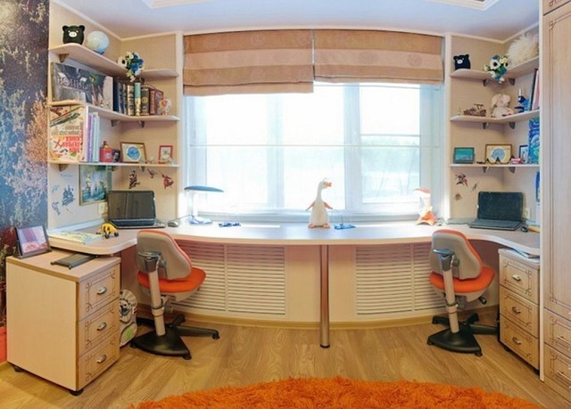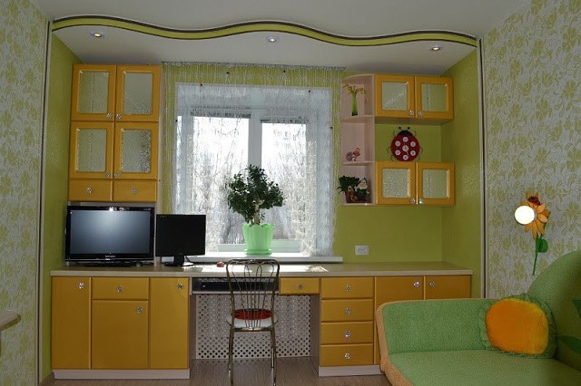 Дитяча кімната – ідеальне місце для такого рішення. Шафи дозволять зручно зберігати речі дитини, а під вікном можна облаштувати зону для навчання чи відпочинку.