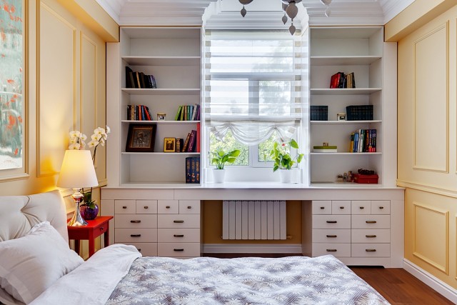 Часто між шафами передбачають вбудоване місце для сидіння або робочий стіл. Це чудове рішення для організації робочого куточка або зони для читання з видом на вулицю.