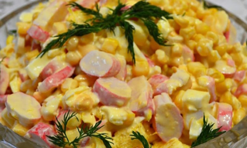 Якщо ви хочете зробити більш легкий варіант салату, то замість класичного майонезу можна додати білий йогурт. Крім кукурудзи, до салату також добре поєднується нарізана кружечками редиска. Бажаю приємного смаку!