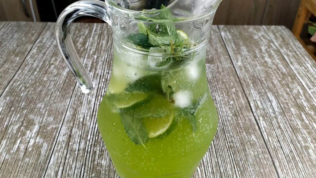 - В концентрат добавляем оставшиеся мятные листья, лед и дольки лимона. Заливаем спрайтом (примерно 1,5-1,7 литра) и хорошо перемешиваем.