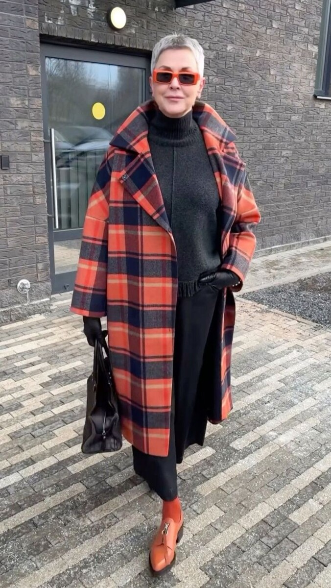 🧥 10. Чёрная юбка с джемпером + пальто в красно-оранжевую клетку