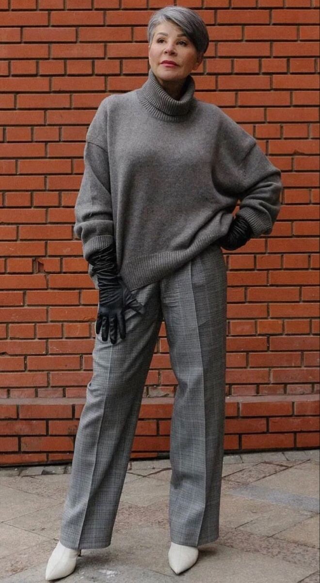 Беспроигрышная комбинация, которая вытягивает силуэт и придаёт строгости образу. Серые брюки — это база, а водолазка создаёт аккуратный и элегантный силуэт. Добавьте украшения для лёгкого акцента.