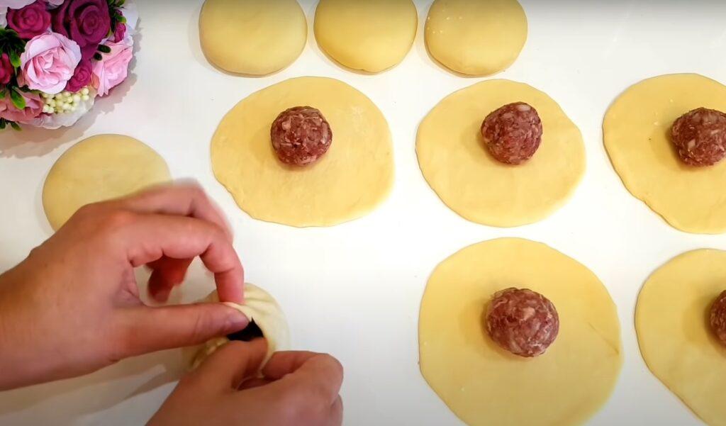 Фарш теж формуємо у невеликі грудочки. Розкачуємо колобки тіста в тонкі коржики діаметром 7 см. У кожен коржик кладемо по кульці фаршу, запечатуємо начинку в тісті, ніби в мішечок.