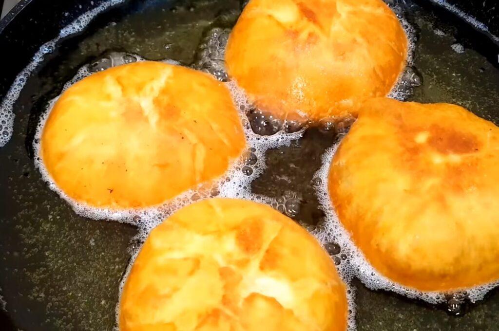 Злегка стискаємо мішечок з начинкою, щоб той був злегка приплюснутий. У сковороді розігріваємо 200 мл олії, обсмажуємо пиріжки на середньому вогні до золотистої скоринки.