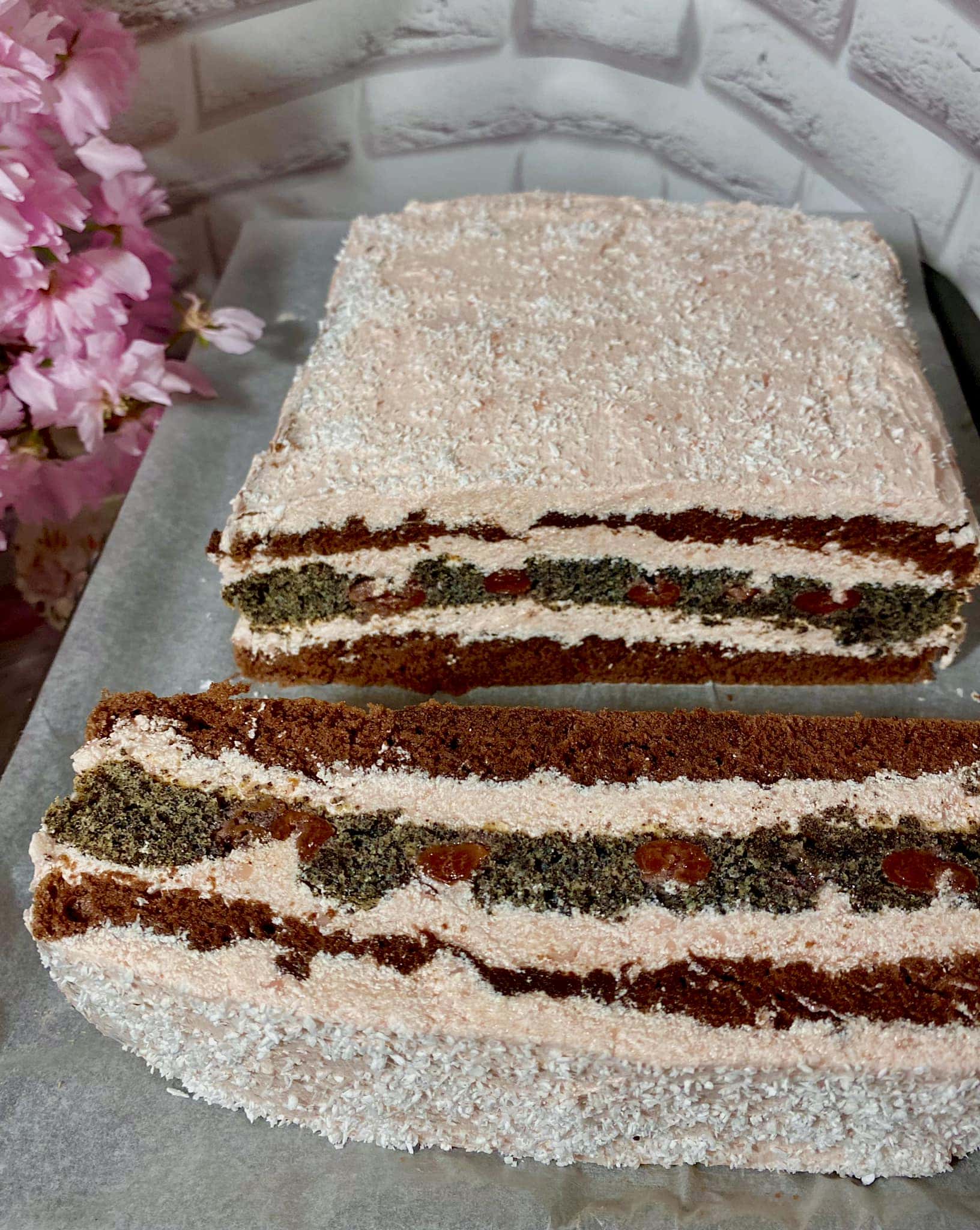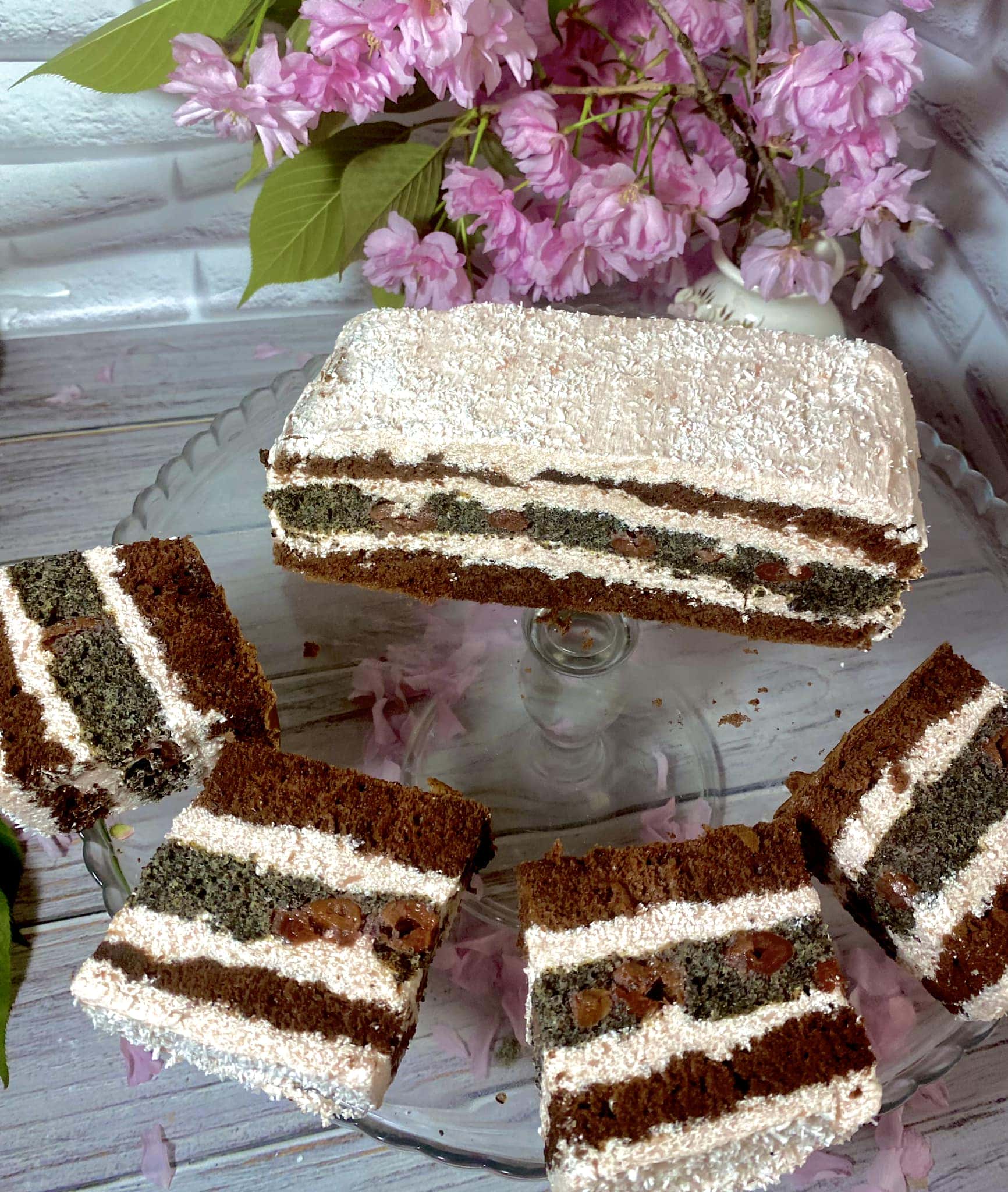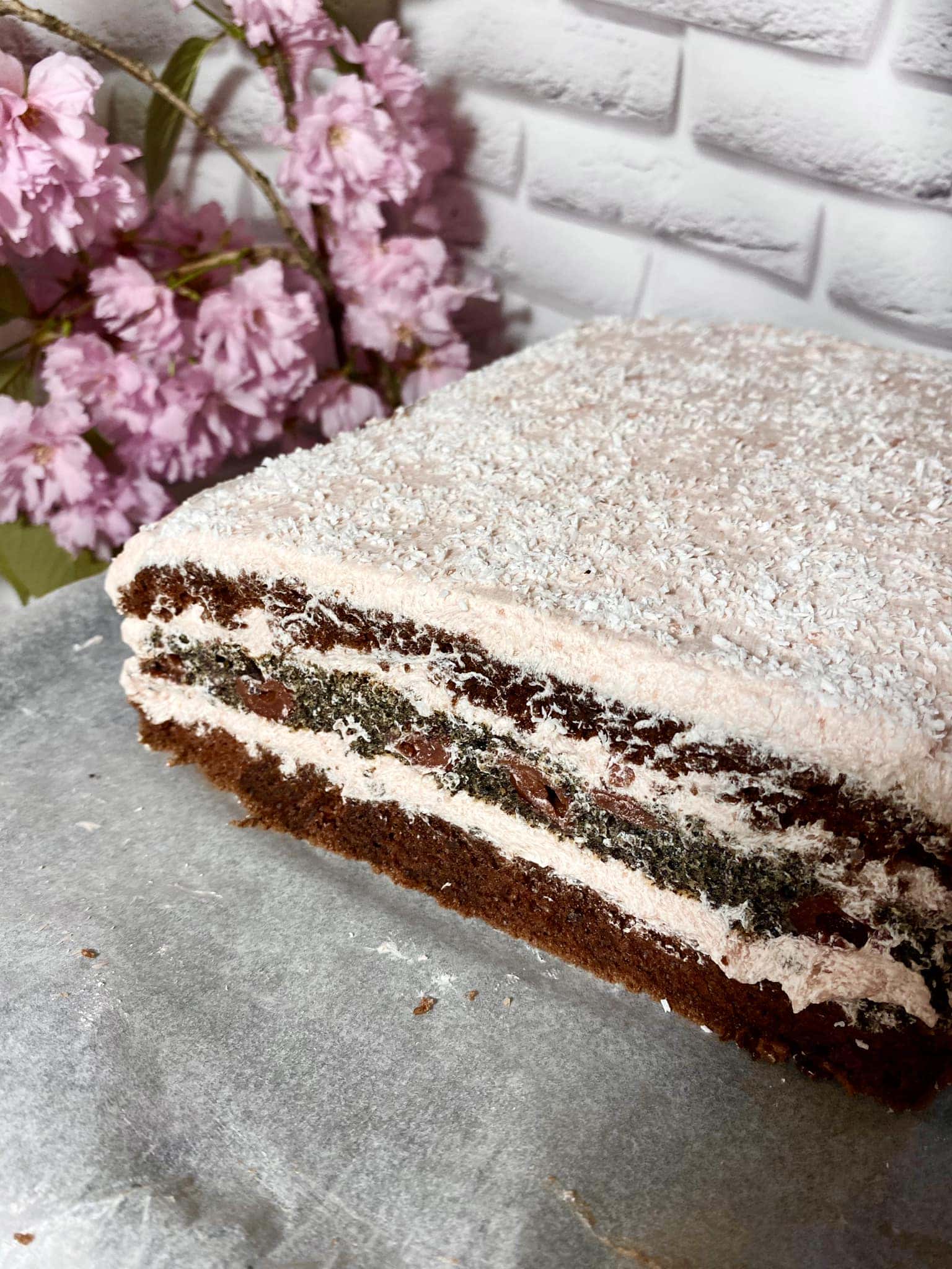Складання: крем ділимо на три рівні частини!! Це важливо. Перший корж шоколадний, перерізаний, змащуємо кремом, потім маковий + крем + шоколадний + крем. Зверху для прикрашення кокосова стружка.