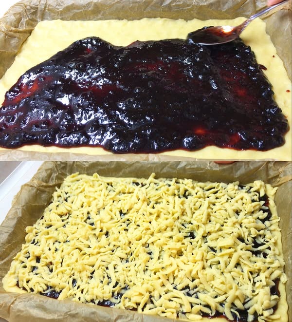 6️⃣ Охлаждённое тесто натираю на крупной тёрке и равномерно посыпаю верх пирога.