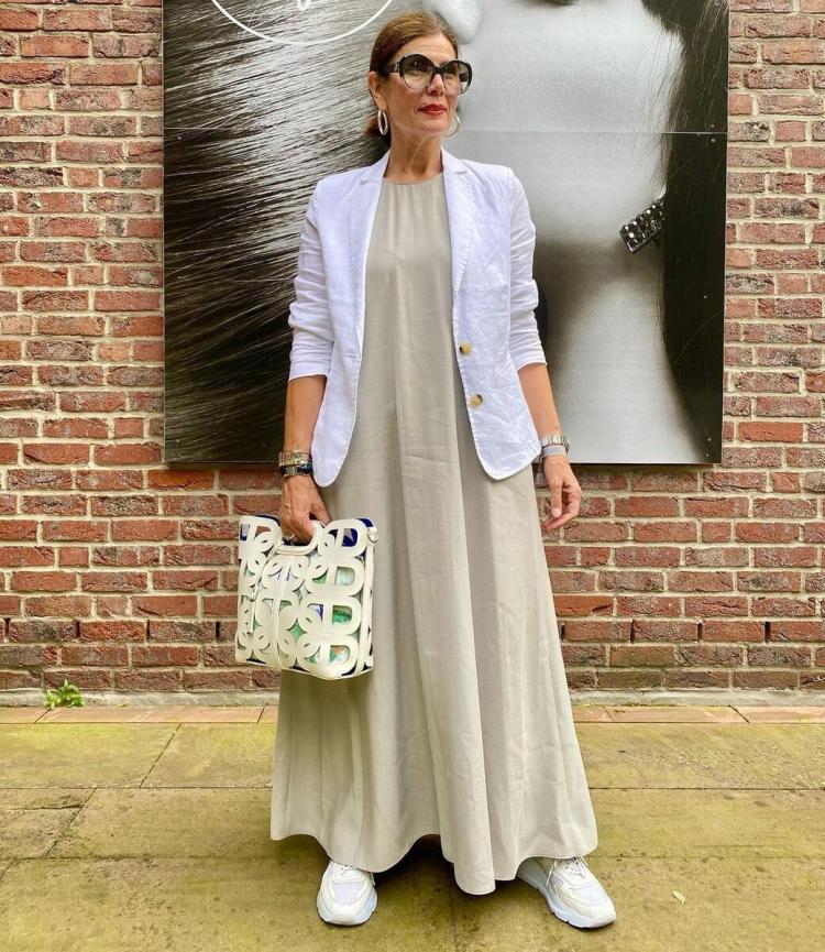 Ніжність у льоні. Лляна сукня-трапеція світло-бежевого кольору у поєднанні з білим жакетом та кежуал-кросівками — це жіночно, зручно й не банально. Такий образ маскує фігурні нюанси й додає елегантності.